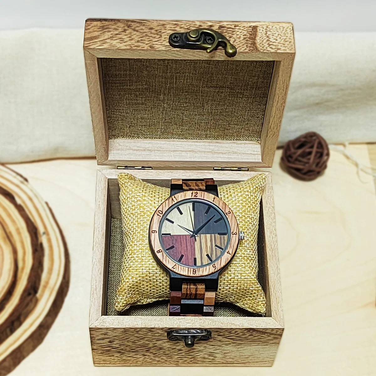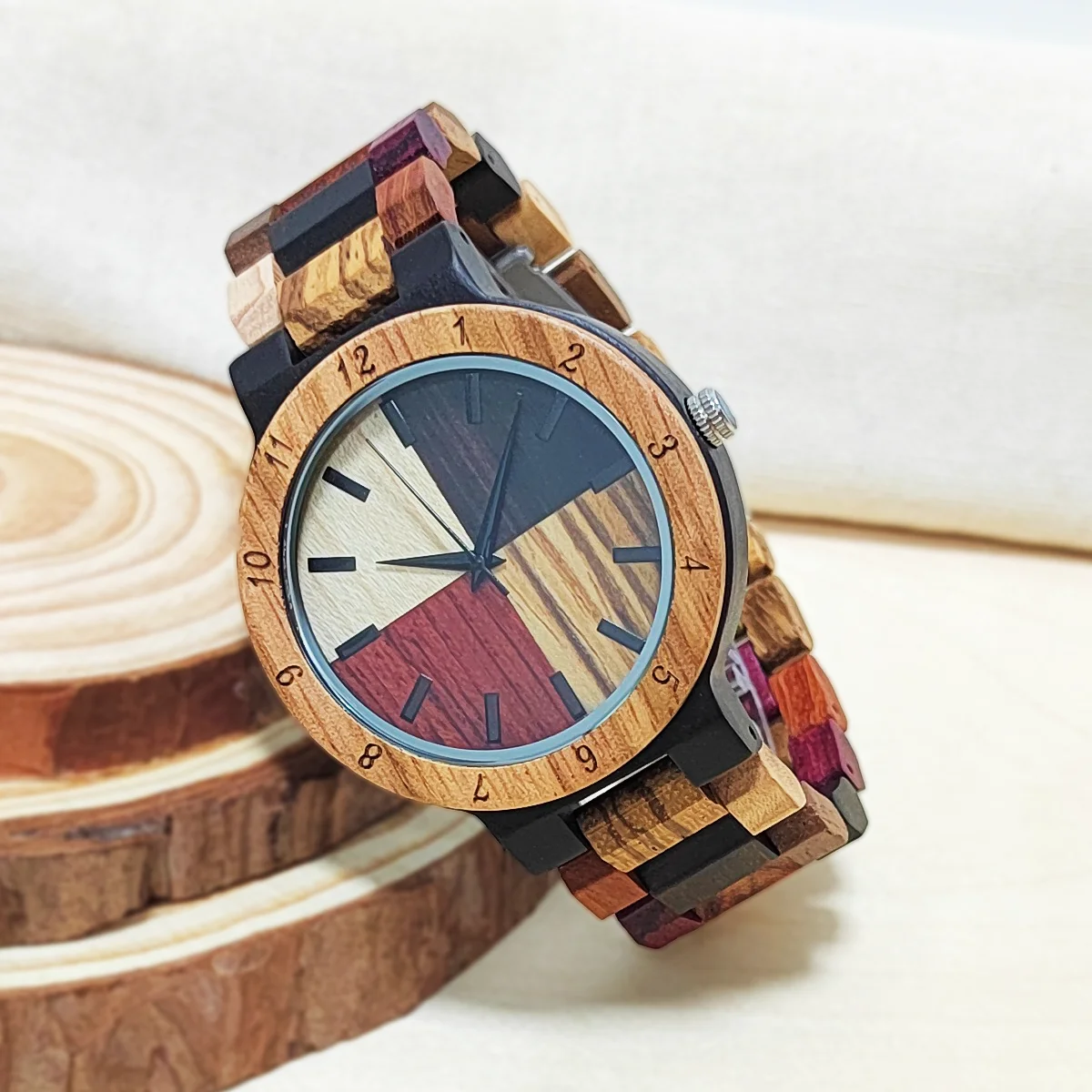 Whether you're looking to make a statement or add a pop of color to your outfit, this men's wooden watch is a versatile and trendy accessory. The combination of a colorful wood strap, spliced dial, all-wood construction, and Arabic numeral engraving makes it a must-have piece for any fashion-forward individual.