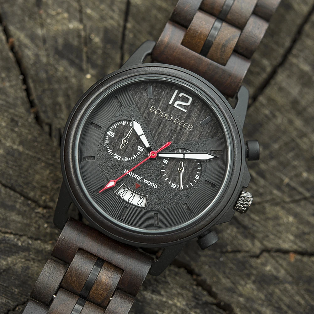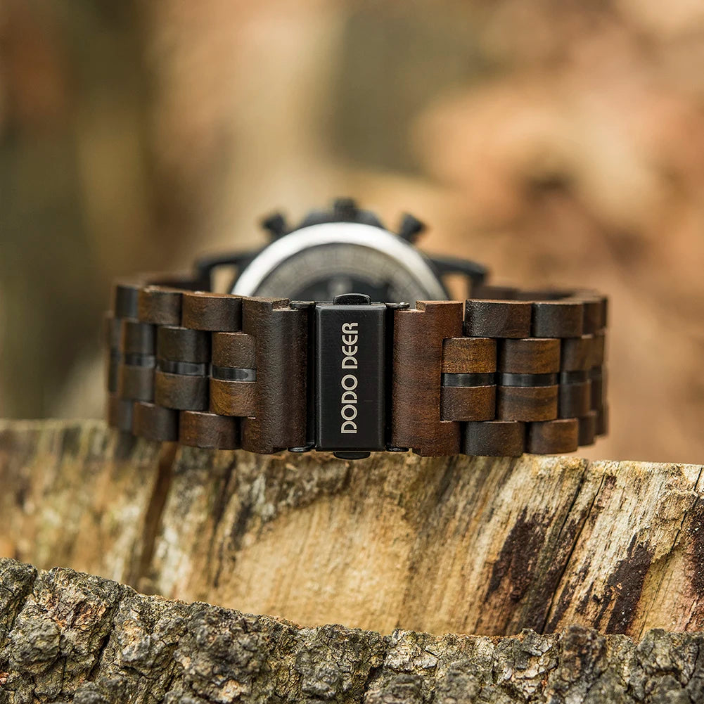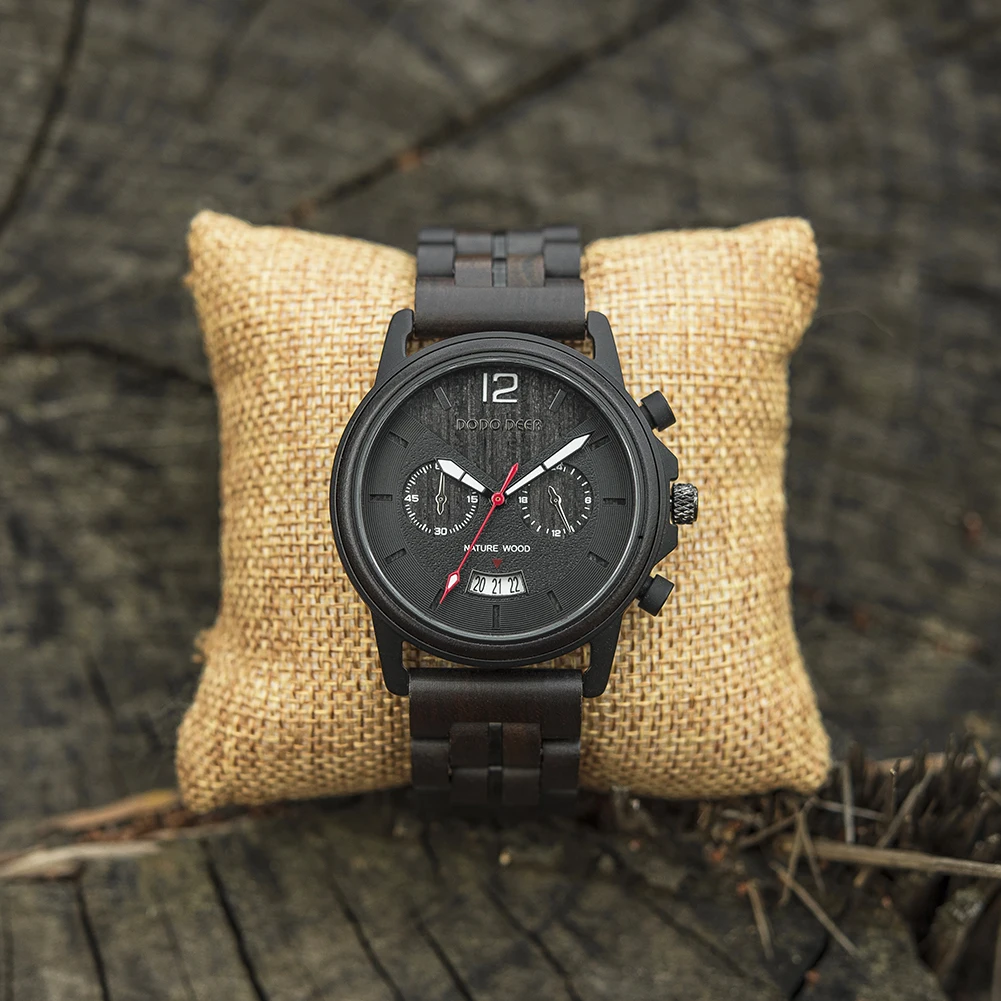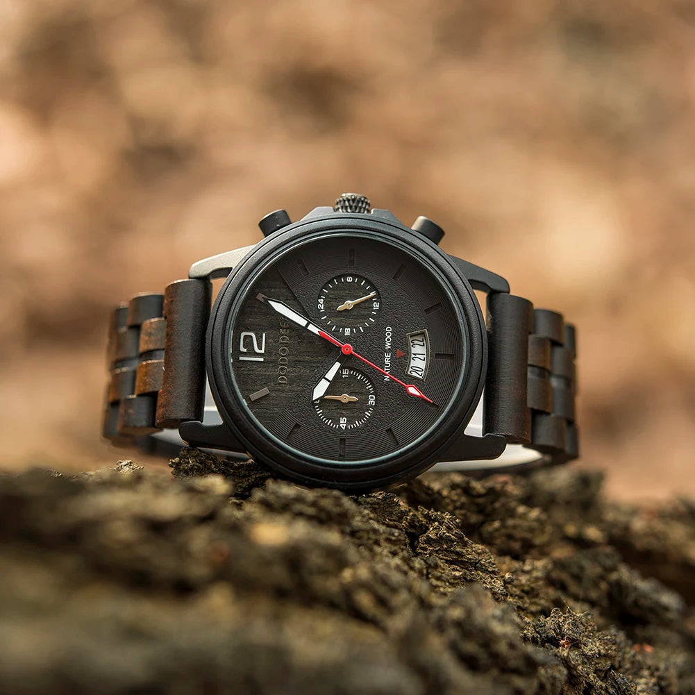 Men’s Classic Fashion Ebony Wooden Quartz Movement Wristwatch - Auto Date Calendar Display