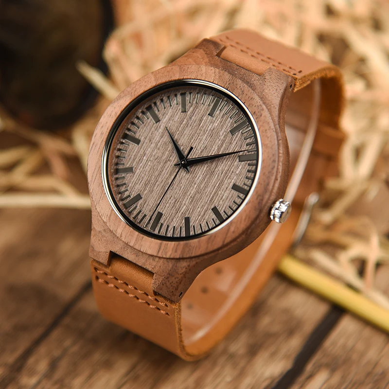 Mens Wooden Face Watch With Leather Wristband - Simple Rustic Timepiece
